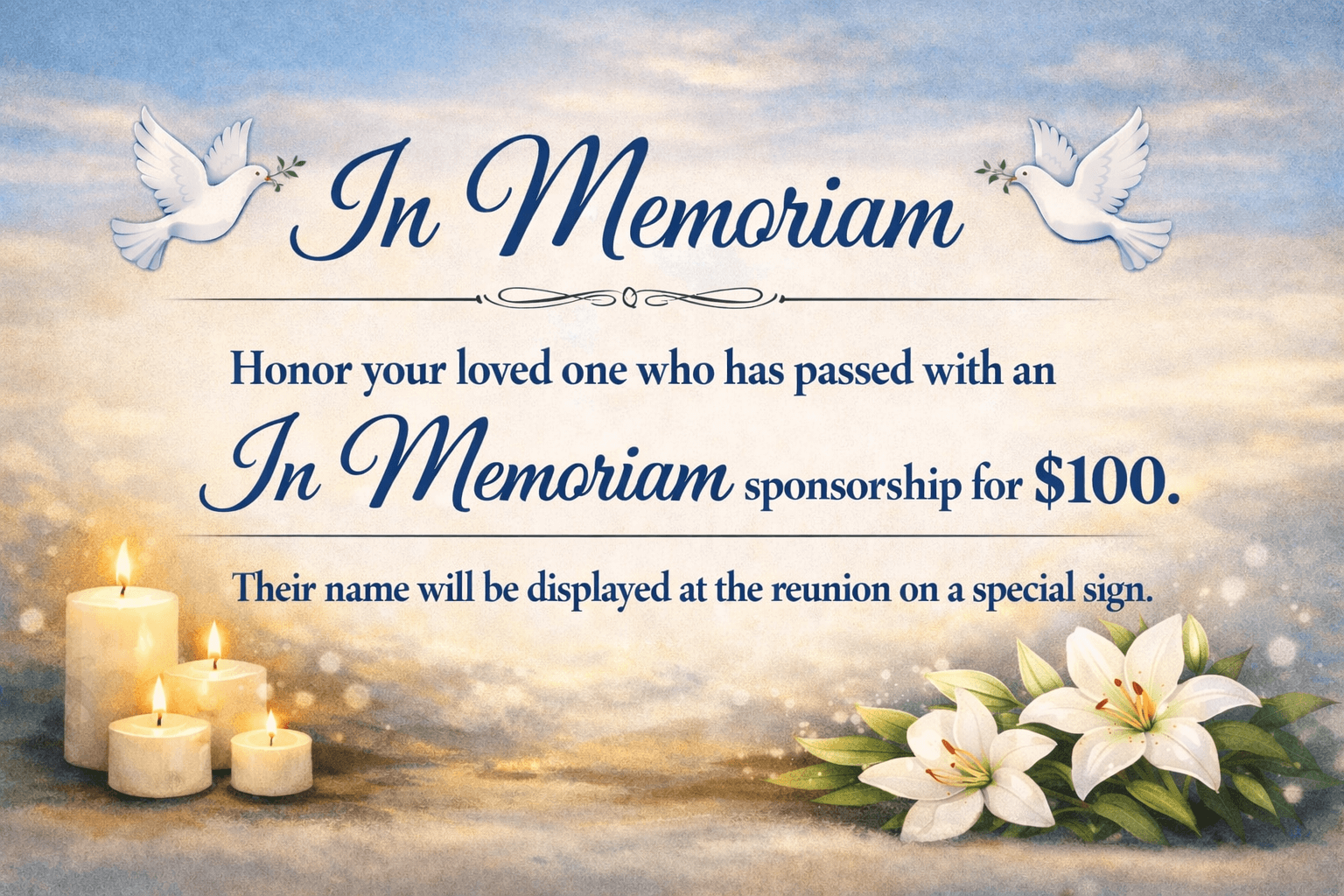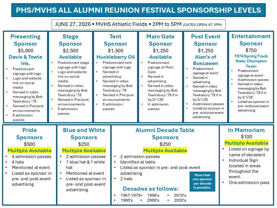 | Sponsorship Level | Pride, Blue and White, Alumni Decade Table, In Memoriam |